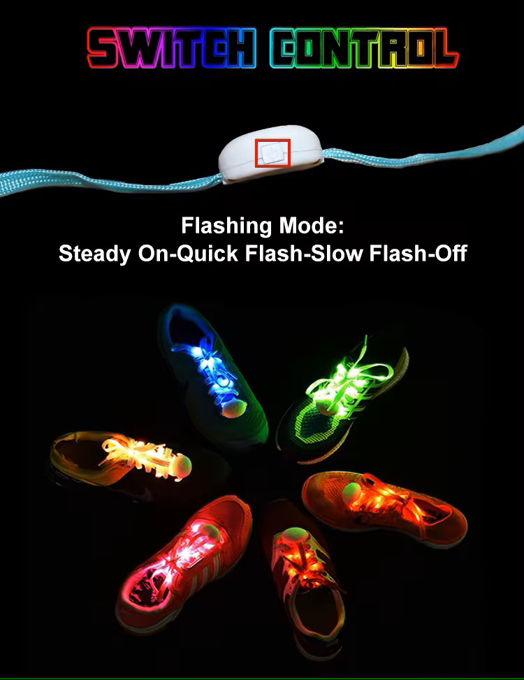 Șireturile Luminoase sunt perfecte pentru orice ocazie: alergare, concerte, dans, petreceri, călătorii sau chiar o seară la bar. Cu patru moduri de iluminare (lumină continuă, flash rapid, flash lent, stins), poți personaliza intensitatea strălucirii în funcție de preferințe.