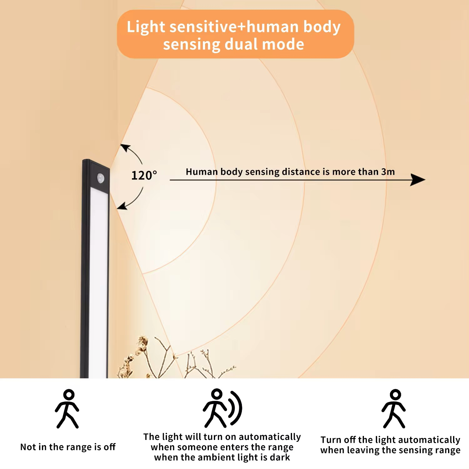 Aprinderea automata se face prin detectarea de la circa 3m a prezentei umane. Stingerea se face dupa 10 secunde de la indepartarea persoanei din zona lampii.